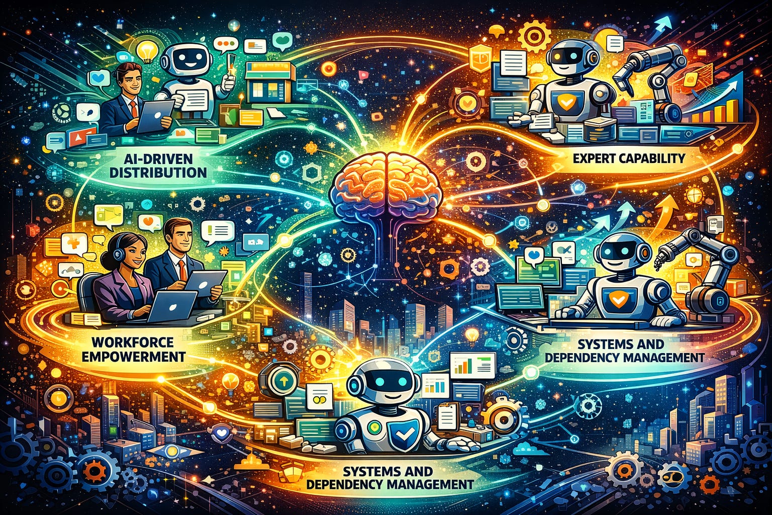 AI transformeert organisaties in fasen: eerst worden individuele taken verbeterd, daarna workflows hertekend, en uiteindelijk verandert het volledige bedrijfsmodel. Net zoals de retailsector evolueerde naar e-commerce, zal AI leiden tot nieuwe manieren van waardecreatie.