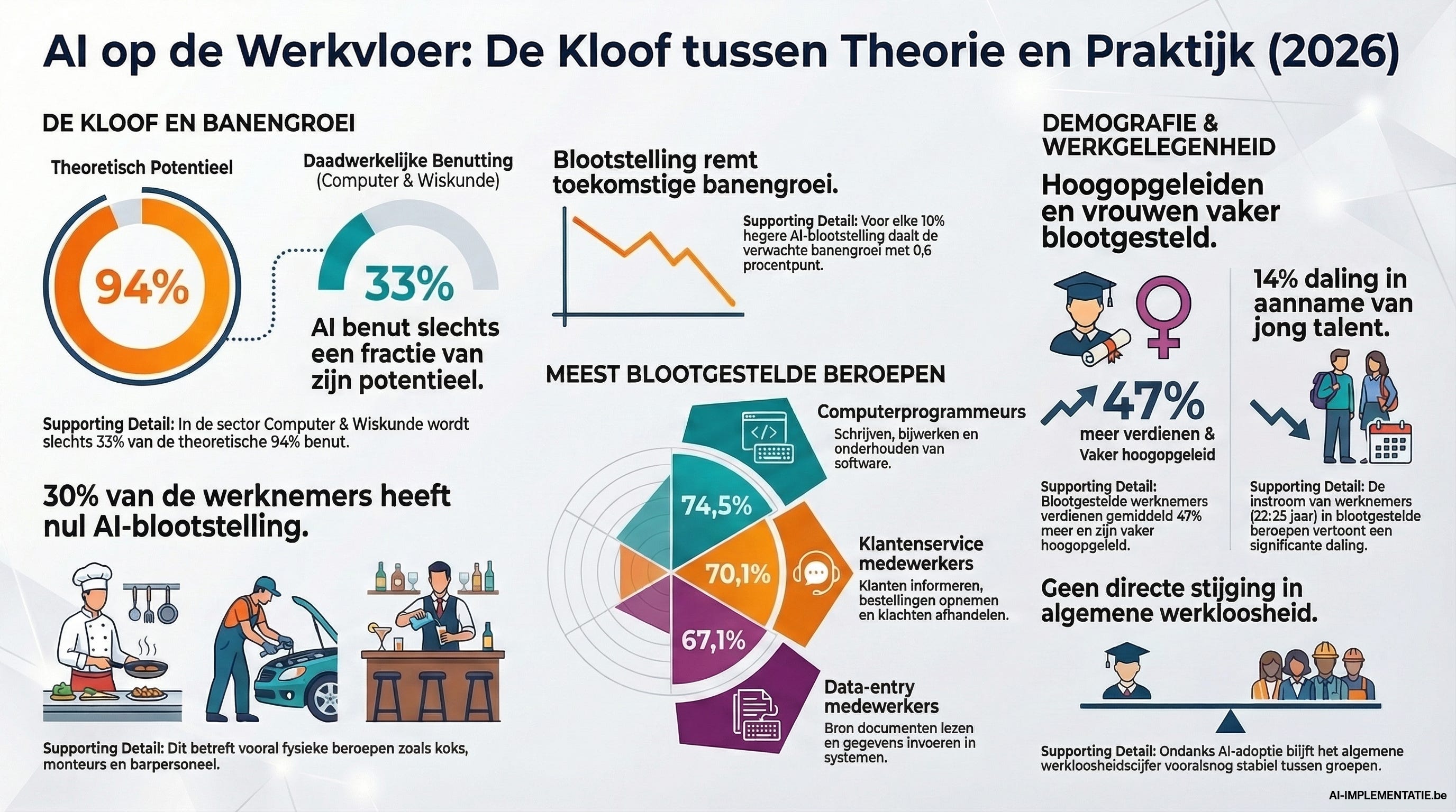 Dit betekent dat de technologie wel potentieel heeft om grote delen van bepaalde jobs te ondersteunen, maar dat de implementatie voorlopig achterblijft. Bedrijven hebben vaak te maken met praktische drempels zoals integratie in bestaande systemen, regelgeving, betrouwbaarheid van AI-systemen en de noodzaak van menselijke controle.