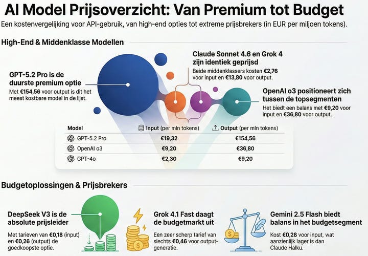 Aan de onderkant van de markt zien we modellen die sterk inzetten op efficiëntie. DeepSeek V3 kost ongeveer €0,13 per miljoen inputtokens en €0,26 per miljoen outputtokens. Dat is tot 95 procent goedkoper dan sommige premiumalternatieven.