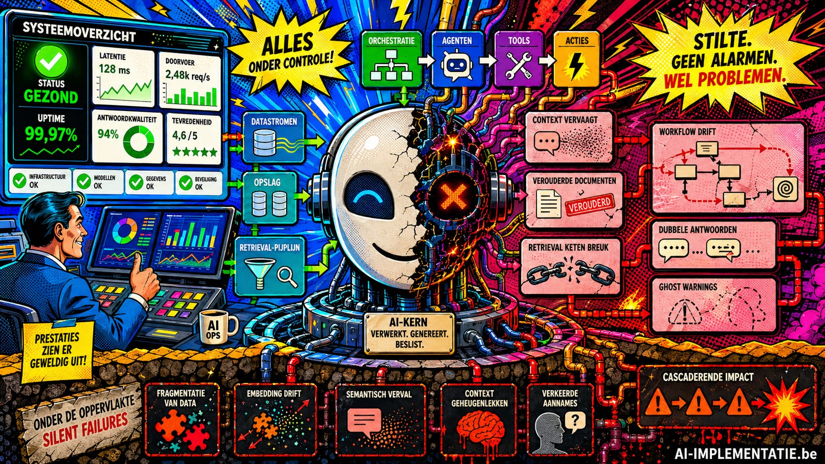 Dat maakt deze nieuwe categorie storingen bijzonder verraderlijk. In traditionele IT is een defect vaak zichtbaar: een server valt uit, een API geeft een foutmelding of een applicatie wordt traag. Bij AI kan het systeem er aan de buitenkant gezond uitzien, maar ondertussen antwoorden baseren op oude documenten, onvolledige data of een verkeerd opgebouwde context.