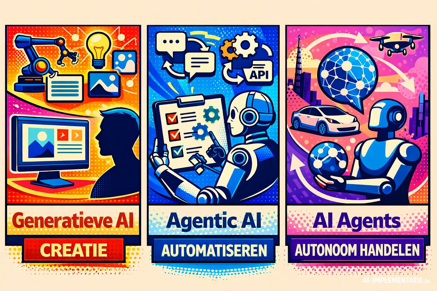 De huidige AI-ontwikkelingen laten zich grofweg indelen in drie categorieën: systemen die creëren, systemen die uitvoeren en systemen die zelfstandig handelen. Hoewel ze soms overlappen in technologie, verschillen ze sterk in toepassing en complexiteit.