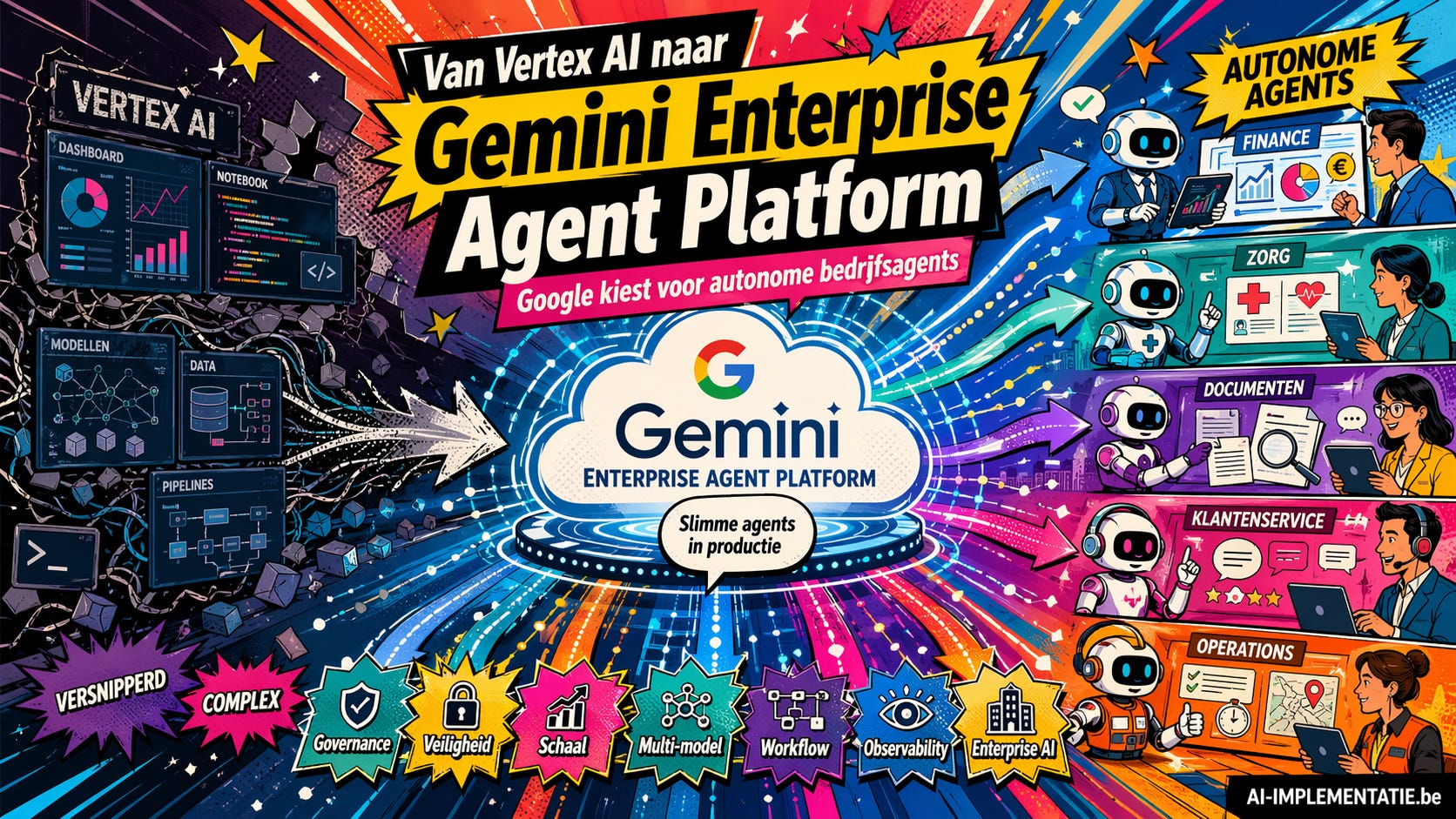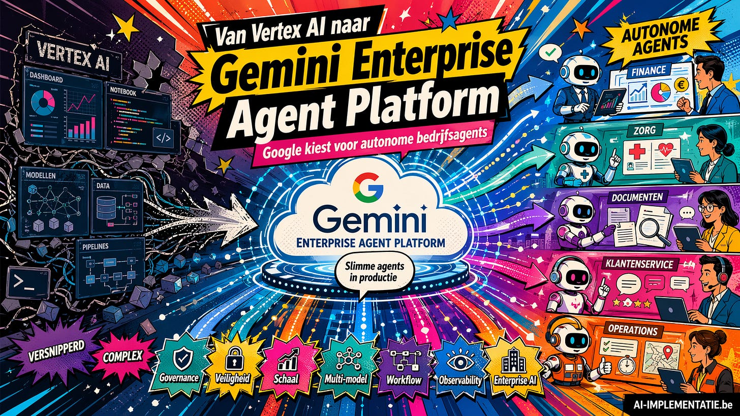 Google Cloud heeft op 22 april 2026 tijdens Cloud Next ’26 een nieuwe laag gelegd onder zijn AI-strategie. Het bedrijf presenteerde Gemini Enterprise Agent Platform als de evolutionaire opvolger van Vertex AI, met als doel bedrijven niet enkel modellen te laten bouwen, maar complete agentsystemen te laten ontwikkelen, uitrollen en controleren. Daarmee verandert ook de positionering van Google Cloud: minder nadruk op generatieve AI als losse tool, meer op AI als operationele softwarelaag voor bedrijven.