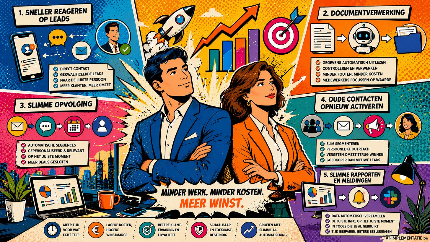 Een van de sterkste toepassingen van AI en automatisering is het sneller verwerken van nieuwe leads. Zodra iemand een formulier invult, een offerte aanvraagt of telefonisch contact opneemt, begint de tijd te lopen. Hoe sneller een bedrijf reageert, hoe groter de kans dat die persoon ook effectief klant wordt.