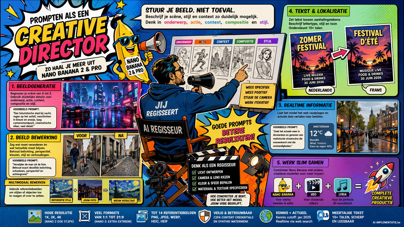 De kernboodschap is helder: Nano Banana 2 en Nano Banana Pro zijn krachtig, maar niet magisch. Wie sterke output wil, moet een prompt schrijven alsof die een scène regisseert. Niet vaag, maar visueel. Niet toevallig, maar doelgericht. En niet in losse trefwoorden, maar in duidelijke creatieve beslissingen.