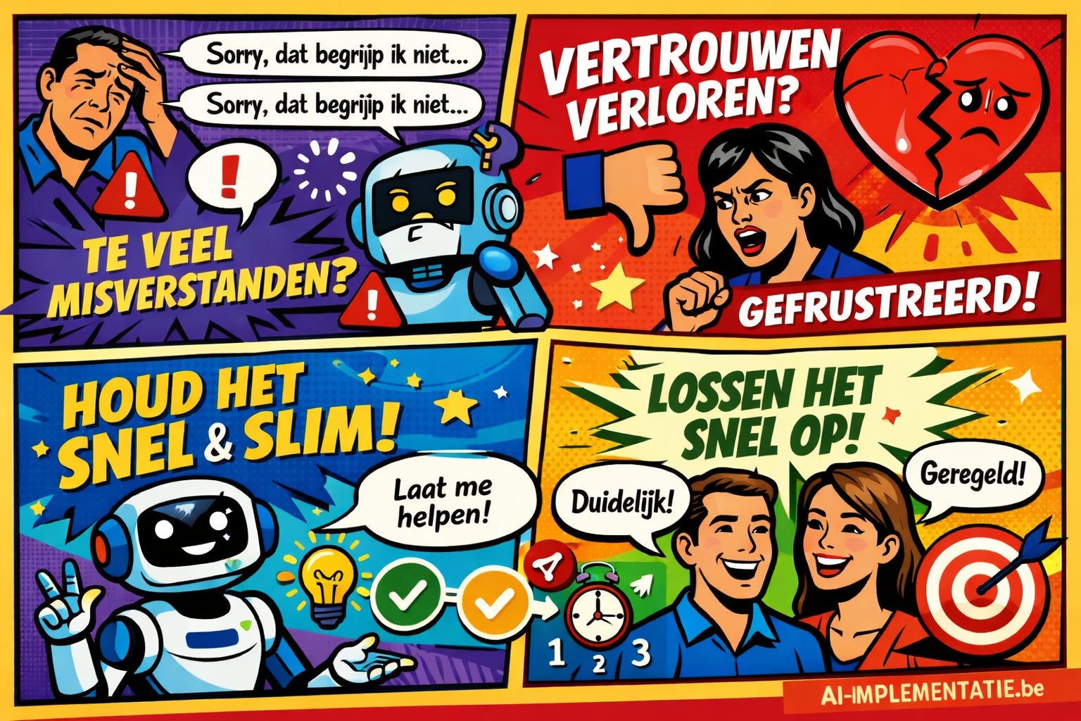 Onderzoek en praktijkervaring laten zien dat de tolerantie hiervoor laag is. Na drie herformuleringen voelt het gesprek als werk. Frustratie ligt op de loer en afhaken is vaak de volgende stap. Slimme AI-systemen herkennen dit patroon en reageren anders: door gericht om verduidelijking te vragen, mogelijke interpretaties voor te leggen of expliciet te benoemen wat ze wél en niet begrijpen.
